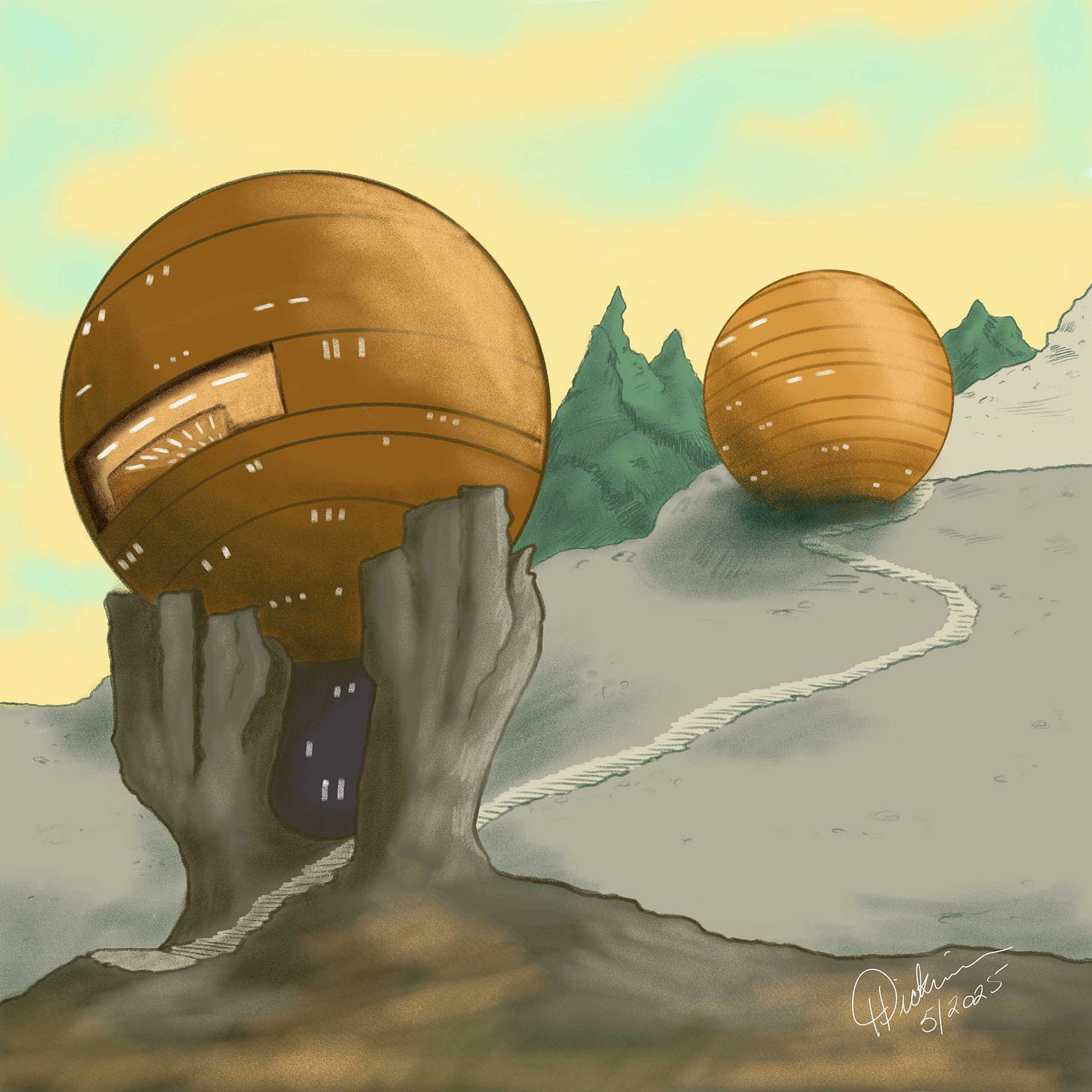 I had developed the accompanying illustration last year (2025) around various reference images of unusual rock formations, one of which were the Trovants or “living rocks” of Romania. One of my favorite artist pastimes is to study photographs and real-world geology, botany, etc., and then try to imagine those shapes in context of science-fiction civilizations. Star Trek episodes like “Encounter at Farpoint” (Season 1, episodes 1 and 2, known as “the space jellyfish” episodes) and Farscape with Moya further cemented this fascination.